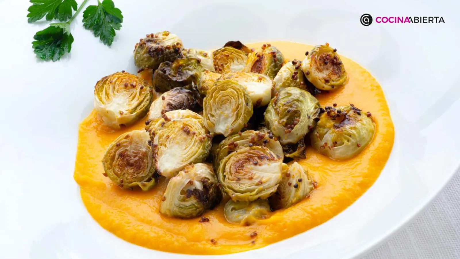 Las coles de Bruselas asadas son un plato saludable que se puede servir como entrante o guarnición. Karlos Arguiñano sugiere acompañarlas con un puré de boniato, al que en esta receta añade puerros y manzana para darle un toque especial.