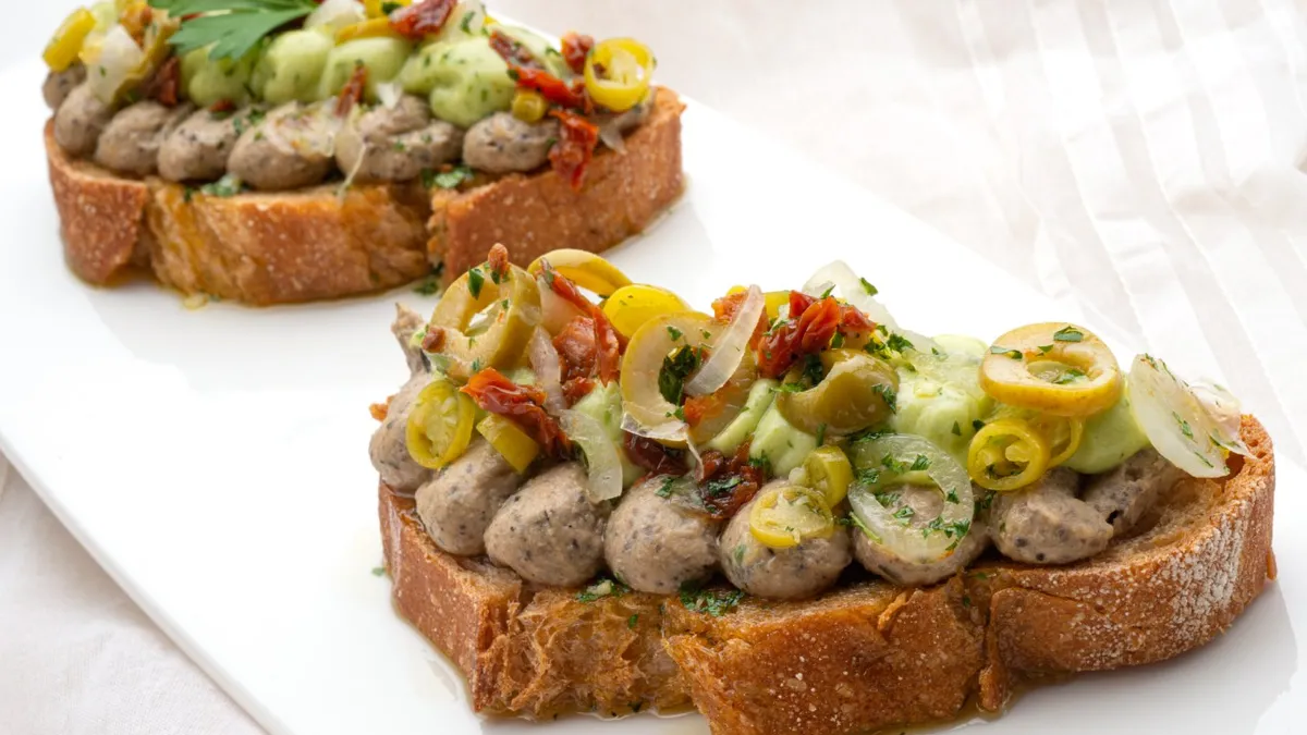 Para que las tostadas no se reblandezcan con el aliño, utiliza pan tipo rústico y tuéstalo bien. Así mantendrán su forma al montar los pinchos.