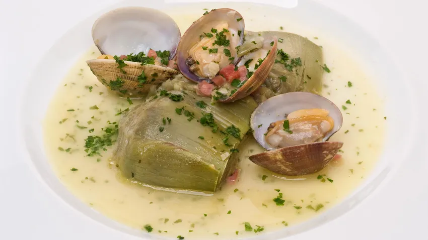 Receta de alcachofas con almejas. Bruno Oteiza prepara en el programa Salud a la carta una receta de alcachofas cocidas con almejas.
