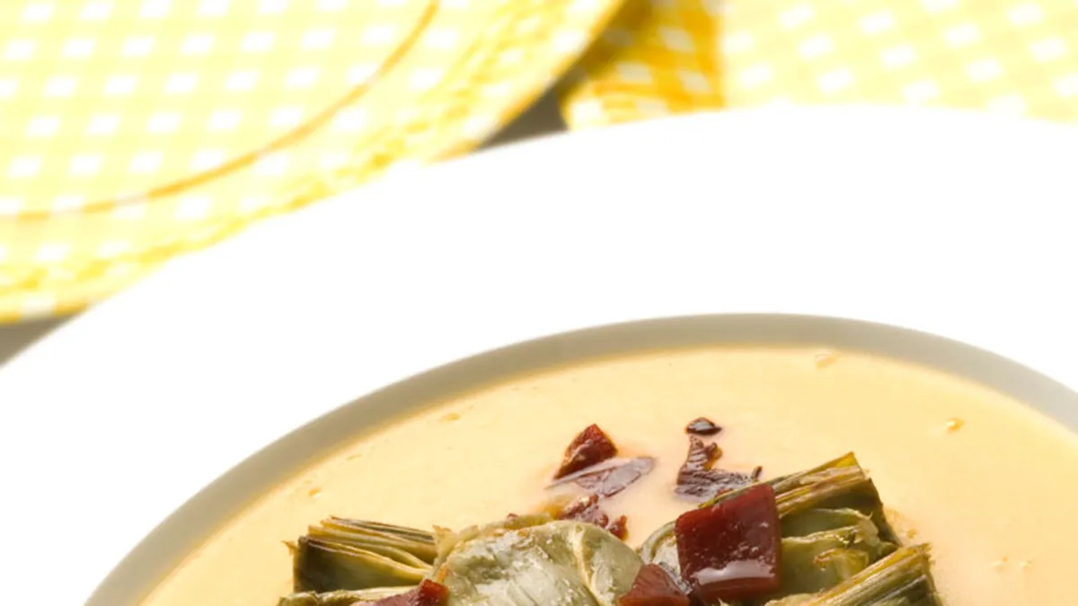 Alcachofas con crema de calabaza y jamón