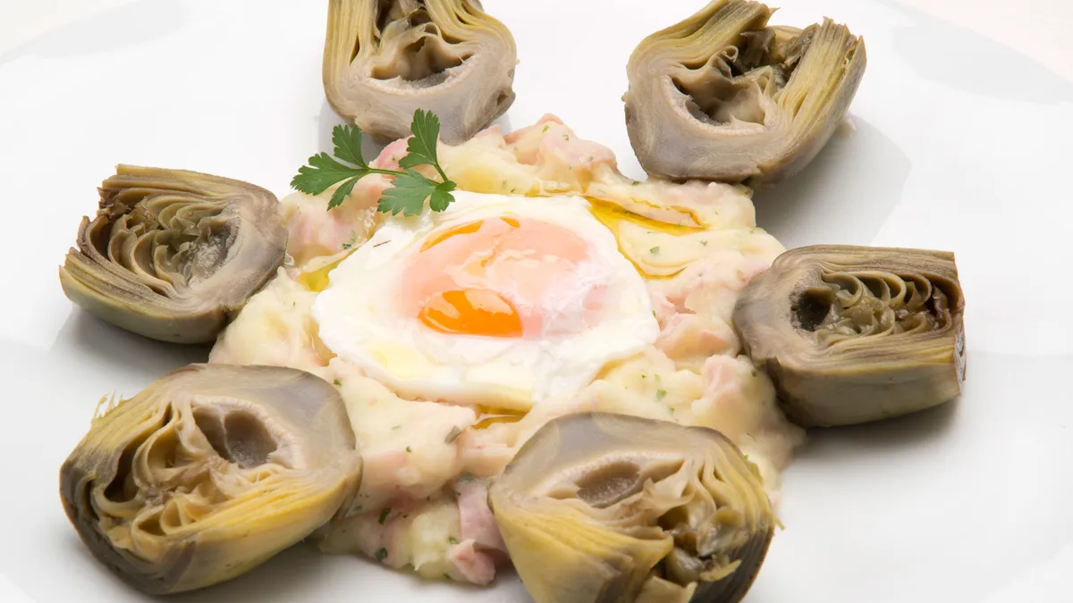 Alcachofas con huevo escalfado y parmentiere de jamón