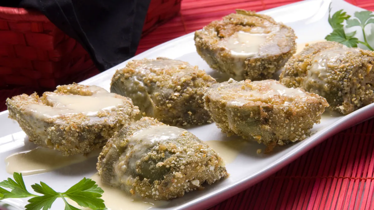 Alcachofas rebozadas con crema de maíz