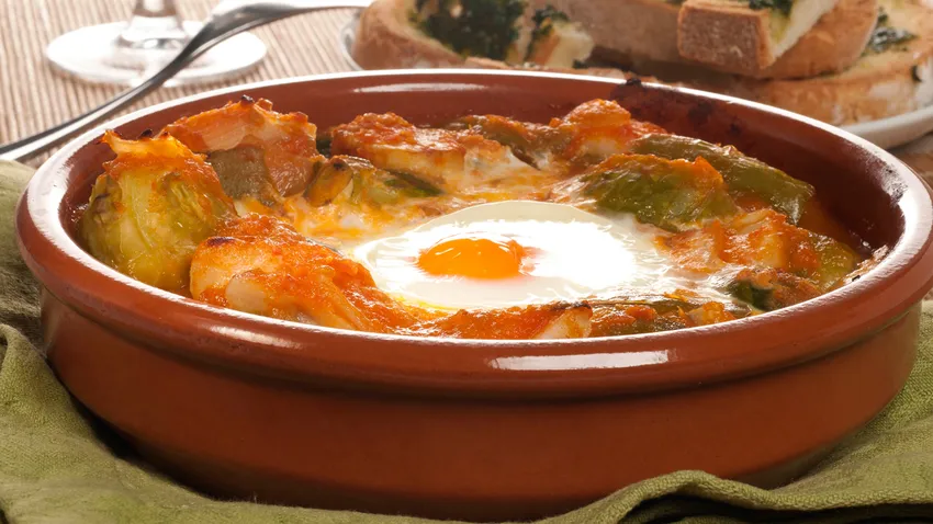 Bruno Oteiza propone un plato para el almuerzo de media mañana compuesto de coles de Bruselas con salsa de tomate casera, bacalao ahumado y huevo, todo ello gratinado en el grill. Y para untar, un pan de ajo y hierbas crujiente .