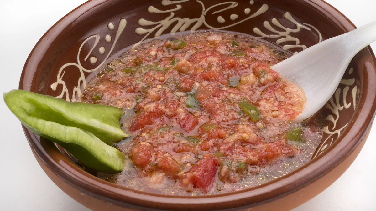 Karlos Arguiñano prepara arranque roteño, un plato típico de Rota (provincia de Cádiz) a base de tomate, pan, pimientos, cebolleta, ajo y aceite de oliva.