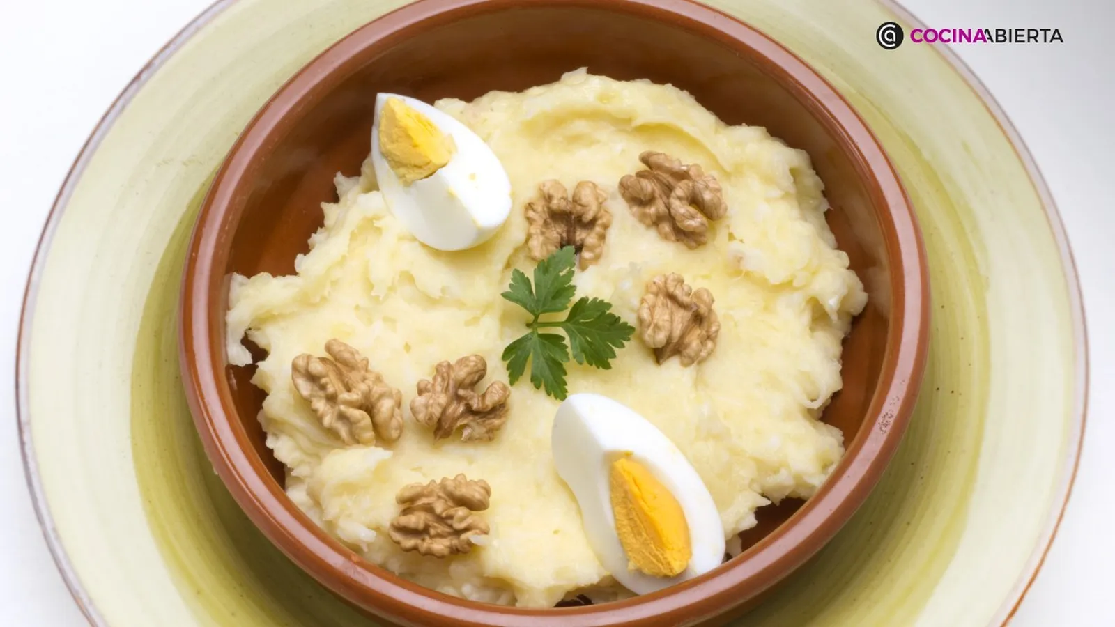 Sirve la mezcla en 4 cazuelas de barro. Adorna con las medias nueces y los trozos de huevo. Coloca una hoja de perejil.