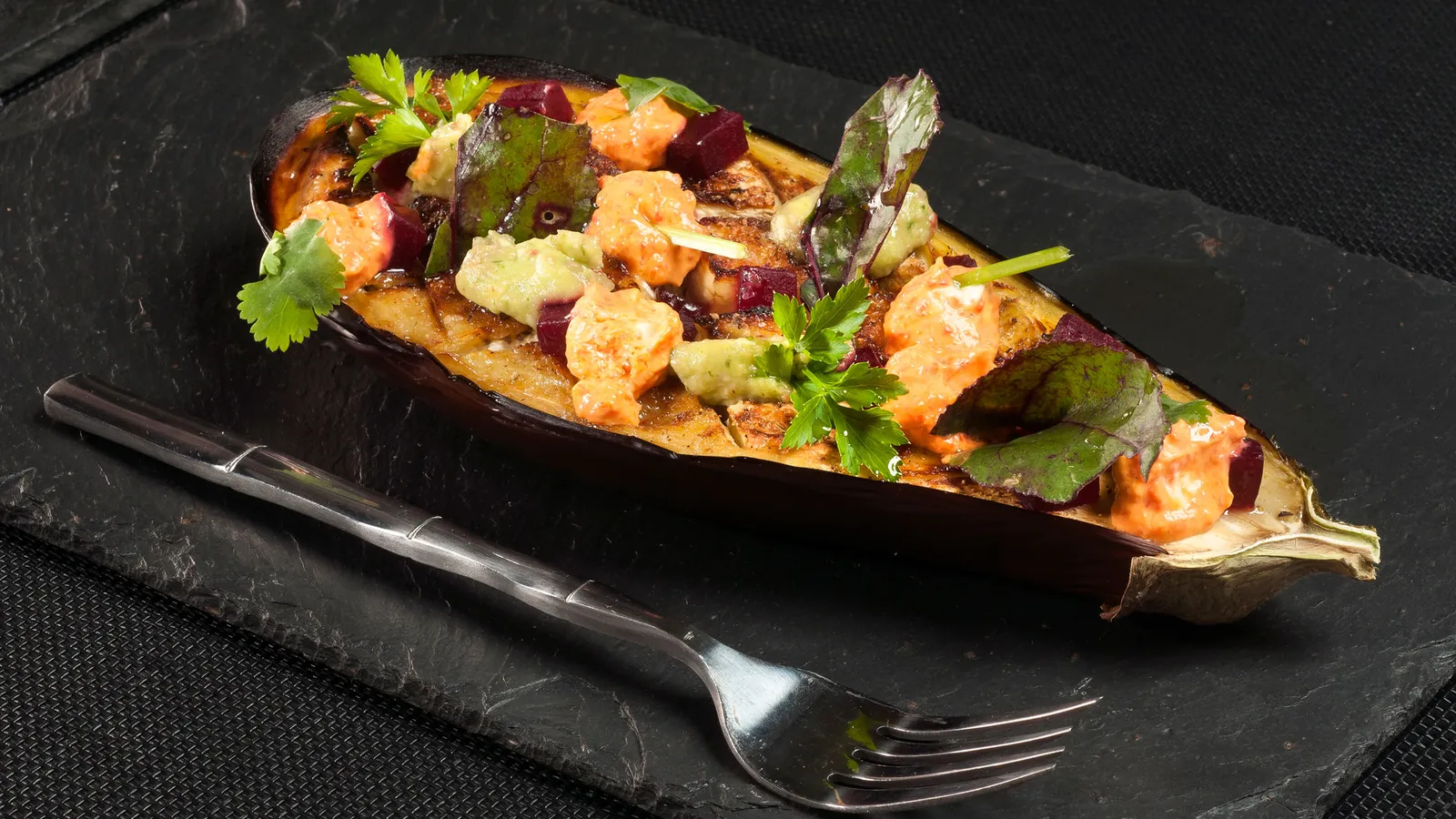 Bruno Oteiza presenta un plato de berenjenas asadas con remolacha cocida, puré de aguacate y puré de pimientos del piquillo.