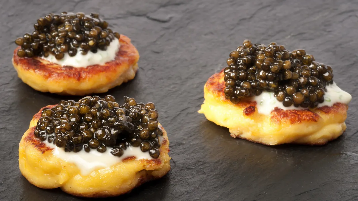 Receta de blinis o buñuelos de patata con crema de queso fresca y caviar. Un aperitivo de Bruno Oteiza.