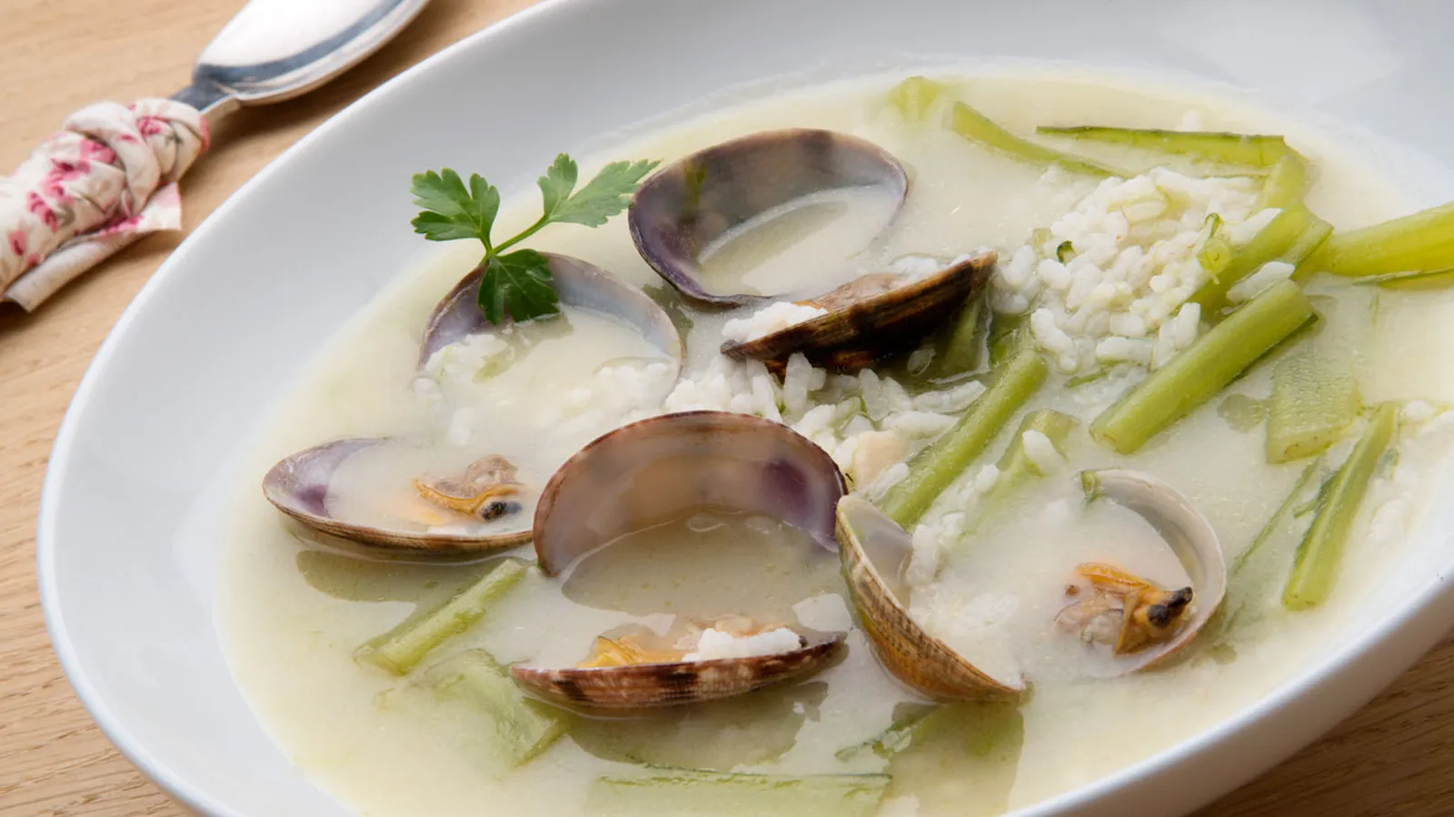 Receta de borrajas cocidas en un caldo de pescado y acompañadas de almejas y arroz. Plato regional elaborado por Karlos Arguiñano.
