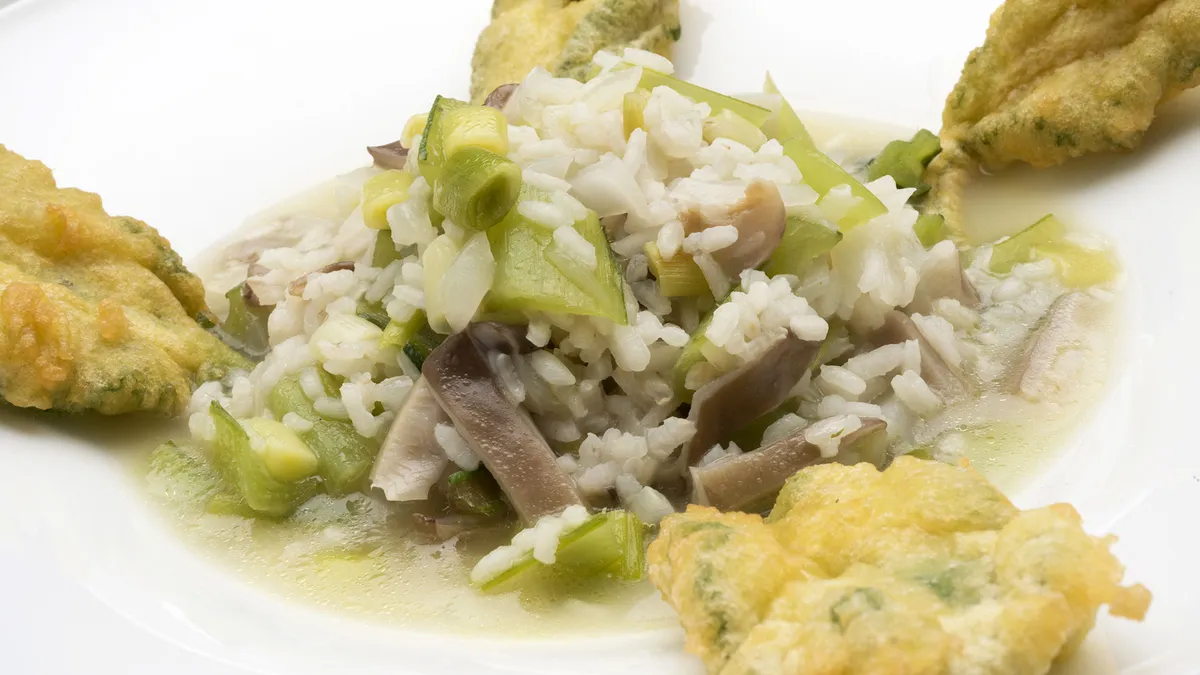 Karlos Arguiñano elabora un plato de arroz con setas, cebolleta y ajos frescos acompañado de hojas de borraja rebozadas en pasta orly.