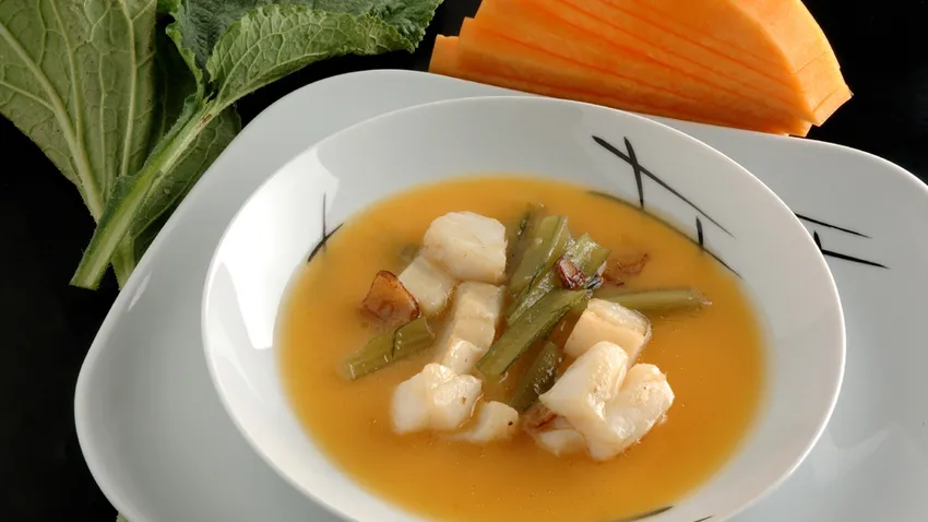 Receta de Borraja con bacalao desalado y crema de calabaza de invierno. Receta del programa Karlos Arguiñano en tu cocina.