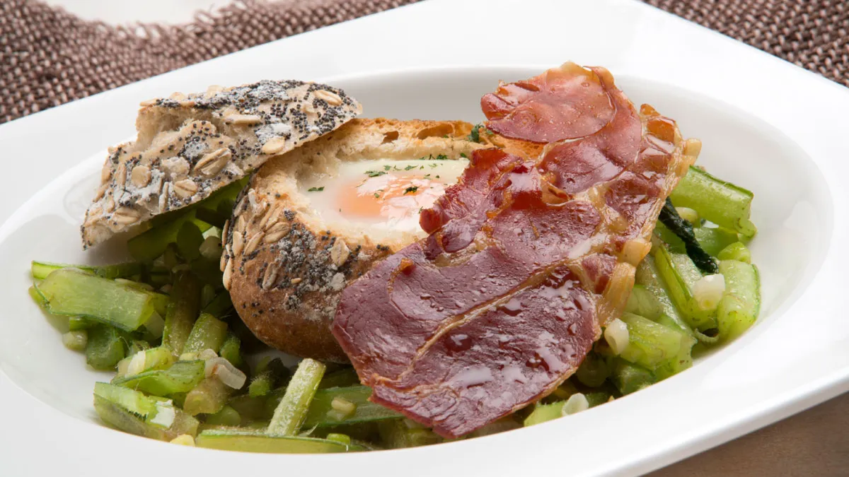 Receta de Karlos Arguiñano de borraja salteada con jamón crujiente y bollos de pan rellenos de huevo cocinado en el horno, un plato rápido de preparar, ideal para comidas o cenas improvisadas.