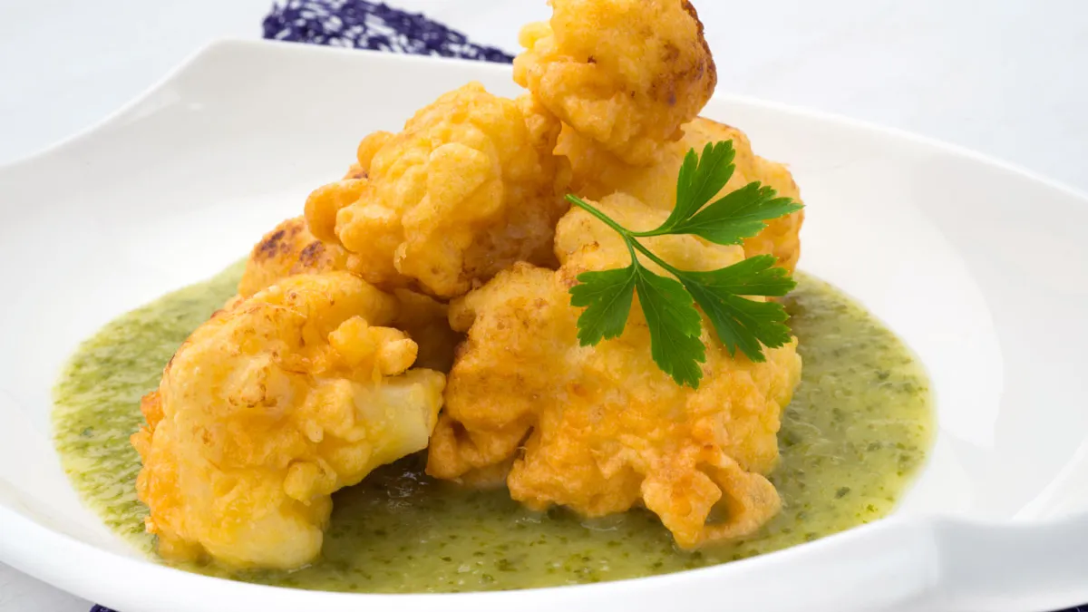 Sirve la salsa en el fondo del plato y coloca encima la coliflor rebozada. Decora con una ramita de perejil.