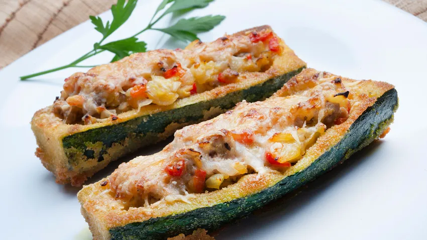 Rellena los calabacines y colócalos en una fuente apta para horno. Cúbrelos con el queso rallado y gratínalos en el horno. Sirve 2 trozos por ración y decóralos con unas hojas de perejil.