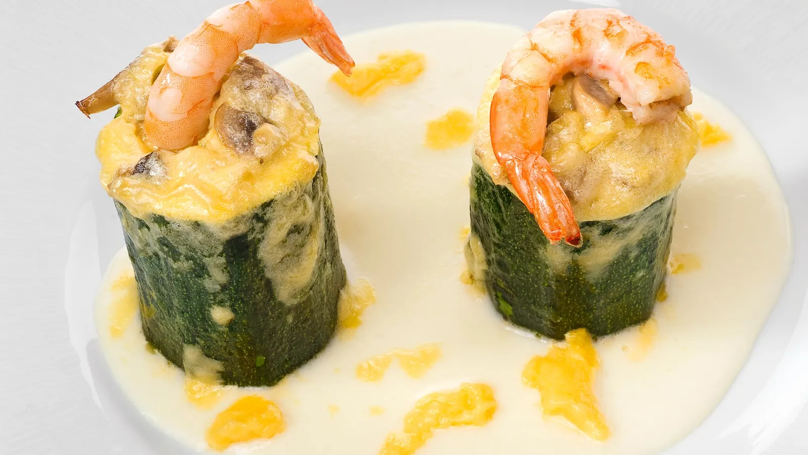 Sirve la crema de coliflor en el plato y pon encima los cilindros de calabacín rellenos. Cubre cada cilindro con un langostino y decora el plato con unas rayitas de la salsa holandesa.