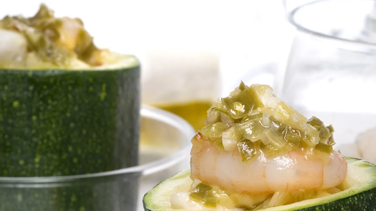 Receta de calabacines rellenos de pescado con pescadilla o merluza y gambas. Receta del programa Hoy cocinas tú presentado por Eva Arguiñano.