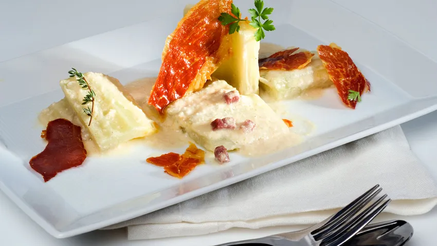 Sirve el cardo en plato hondo con abundante salsa. Acompaña con el jamón crujiente y decora con perejil y tomillo.