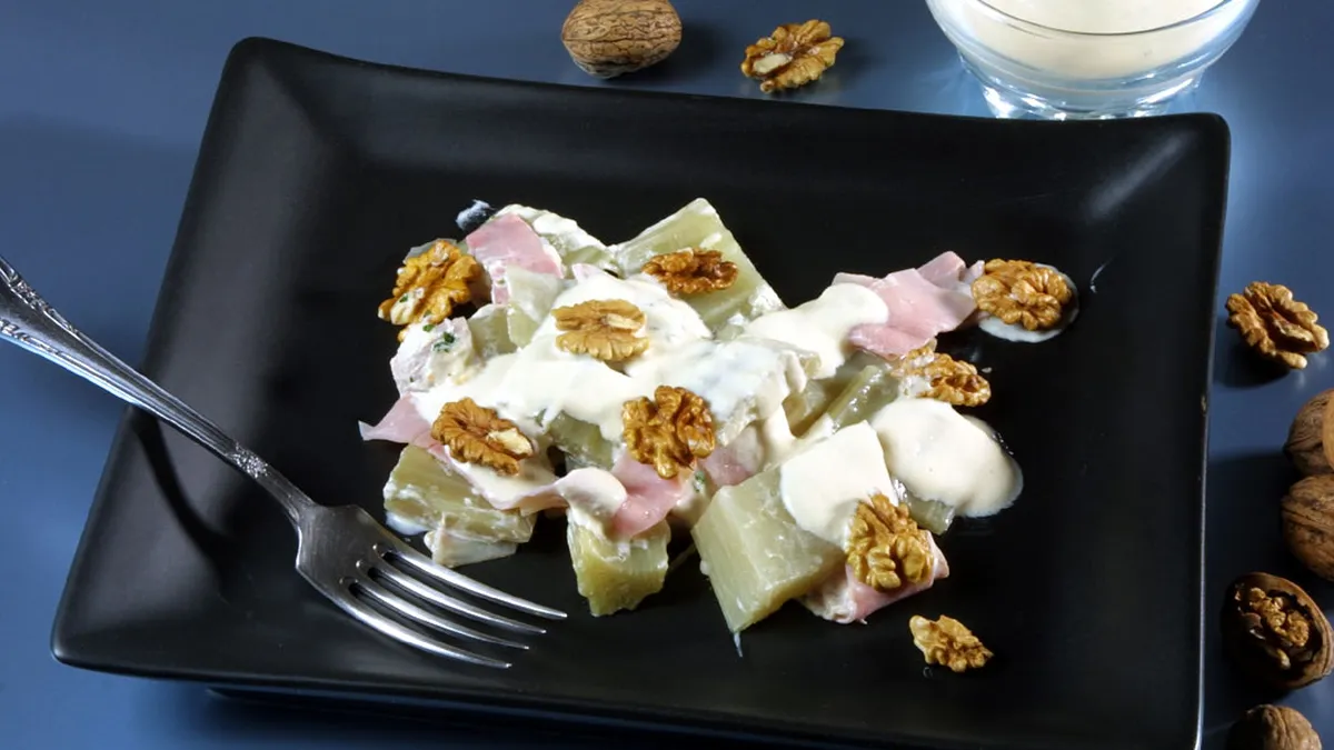 Receta de cardo cocido con nueces y jamón cy acompañado de una salsa de queso. Plato típico de Navidad elaborado por Karlos Arguiñano.