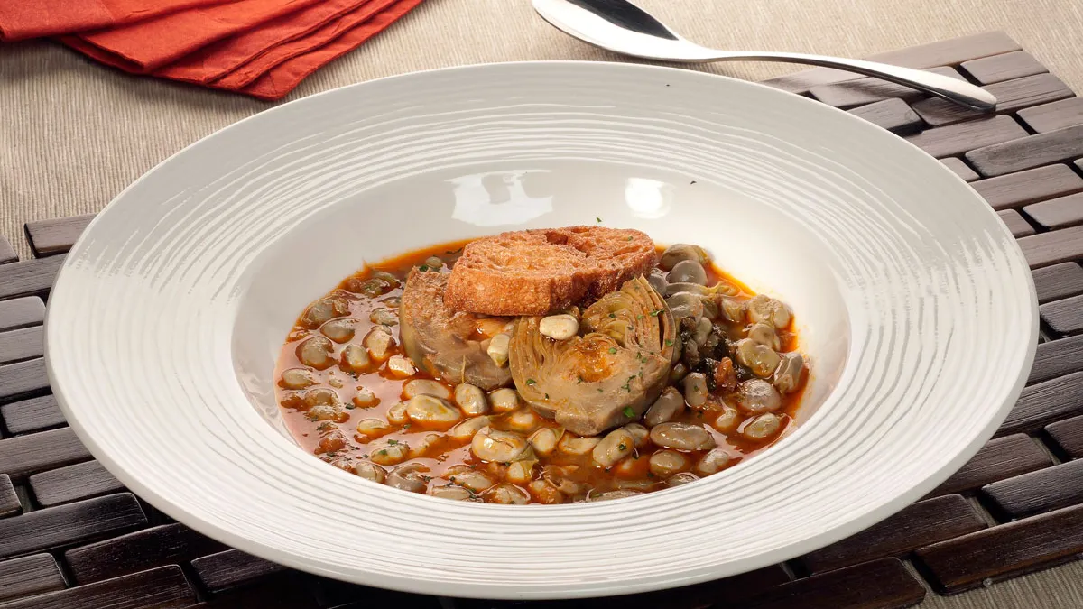 Receta de Bruno Oteiza de cazuela de habas con alcachofas y hierbabuena acompañadas de pan frito.