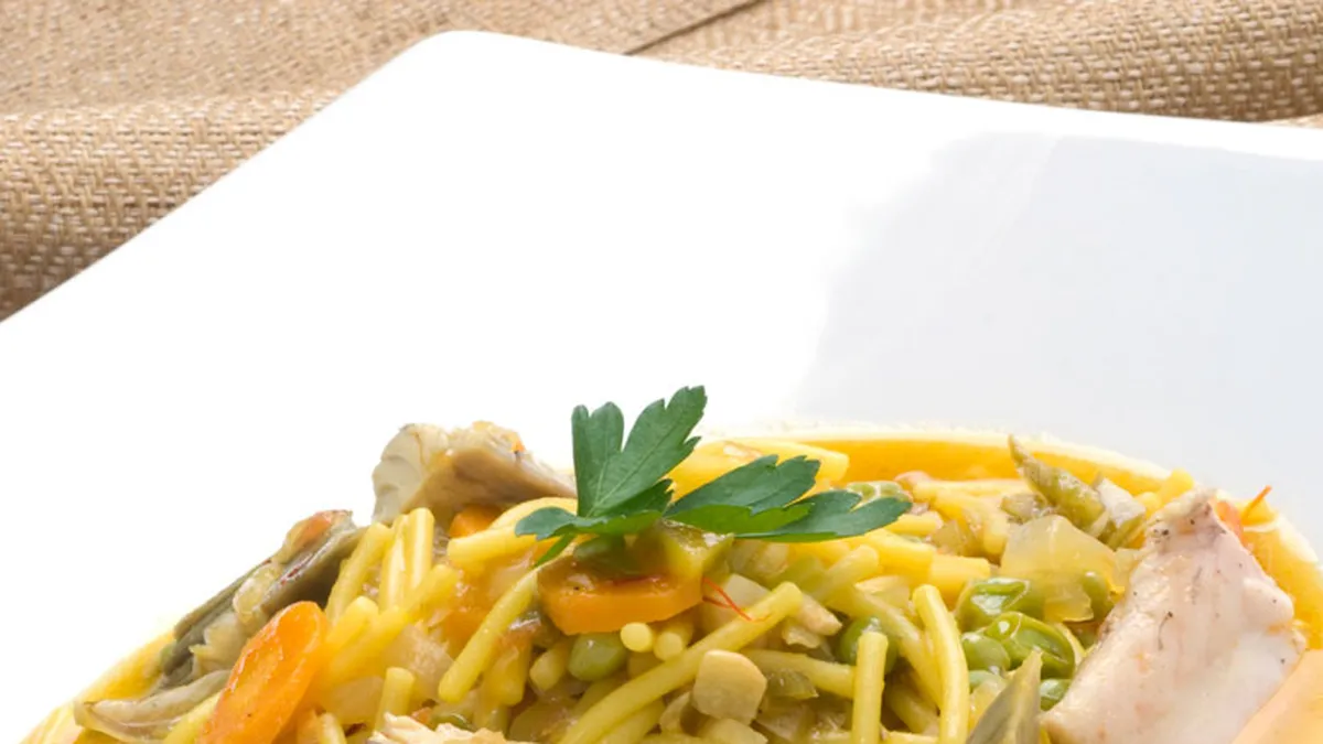 Desgrana los guisantes e incorpóralos a las verduras pochadas junto con una hoja de laurel, una cucharadita de comino en grano y unas hebras de azafrán. Añade los fideos y el caldo de pescado. Remueve, sazona y deja cocer durante 10-12 minutos.