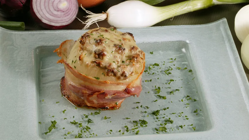 Receta de cebollas envueltas en tocino y rellenas de carne picada y verduras.
