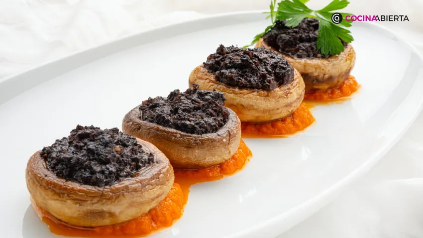 En esta receta, Karlos Arguiñano los presenta sobre una salsa de pimientos morrones, preparada con los tallos de los champiñones que luego se trituran para aprovechar todo su sabor.