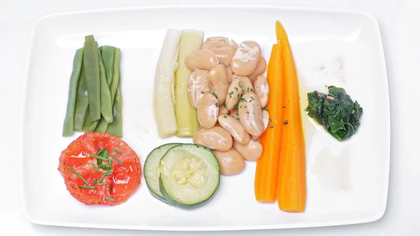 Sirve los judiones sin caldo en un plato llano y acompaña con las verduras.