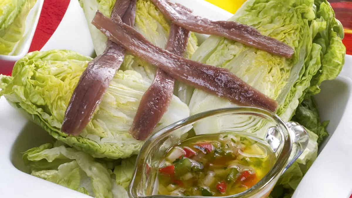 Sirve los cogollos con las anchoas y riega con la vinagreta.