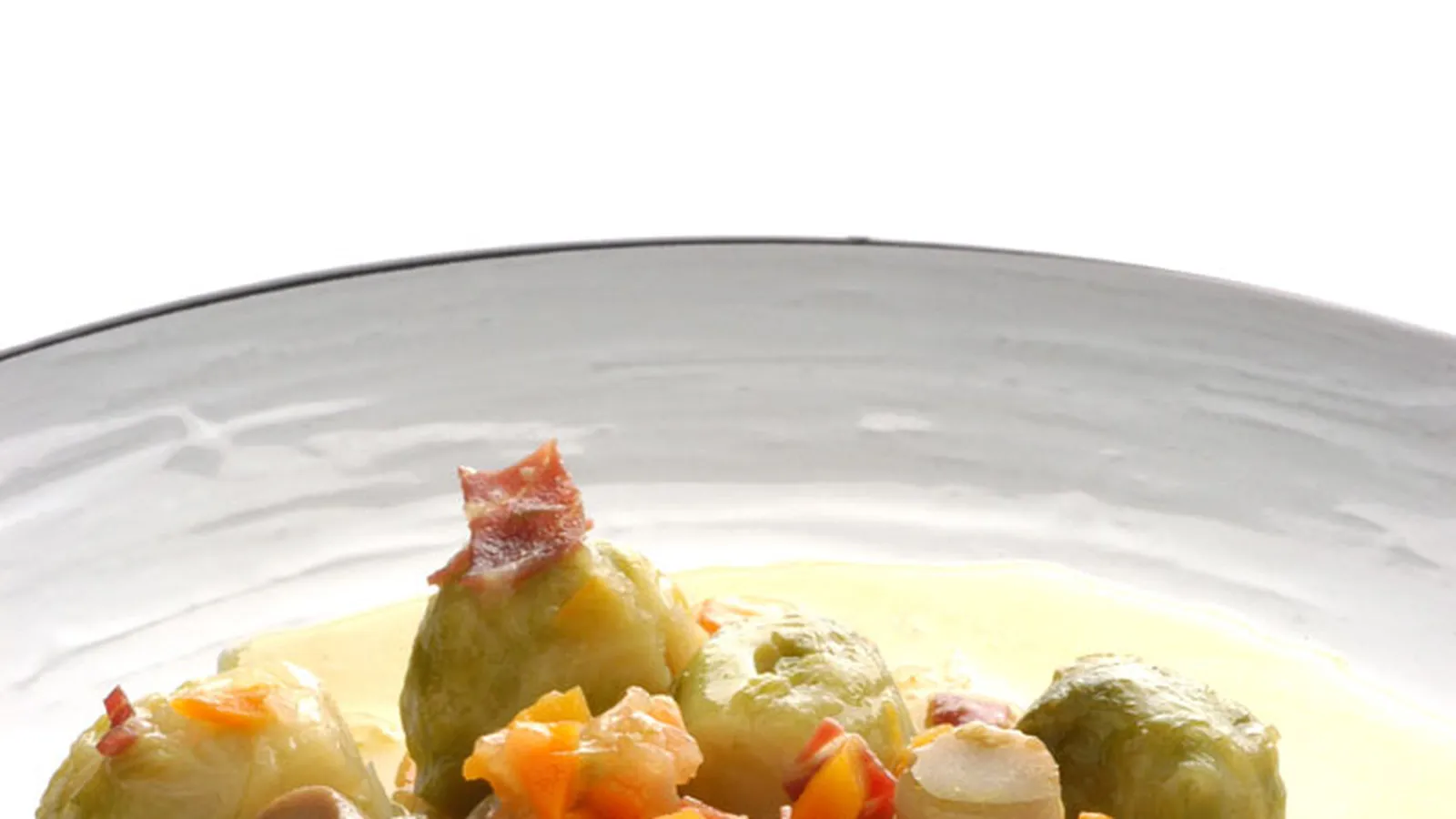 Receta de coles de bruselas con champiñones, un plato tradicional con jamón serrano y su salsa de vino blanco. Receta de Karlos Arguiñano