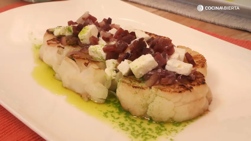 Primero herviremos la coliflor pocos minutos para ablandarla y que sea más fácil de cortar en rodajas antes de pasarla por la plancha. Y luego, le daremos un toque caramelizado con la cebollita morada (que también haremos a la plancha). Su resultado, ¡una delicia crujiente y caramelizada a partes iguales! Y para rematar, una salsita verde de aceite y perejil. ¡Explosión en cada bocado! ¿Te apuntas a probarlo?