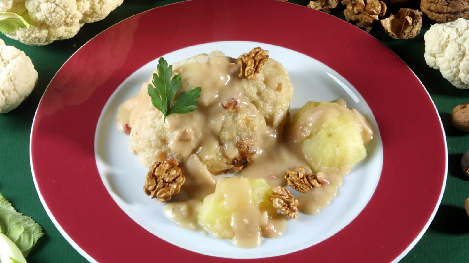 Escurre las verduras, coloca la coliflor en el centro de una fuente resistente al calor del horno, dispón las patatas alrededor. Napa la coliflor con la veloute e introduce en el horno a gratinar. Decora con el resto de las nueces y una ramita de perejil.