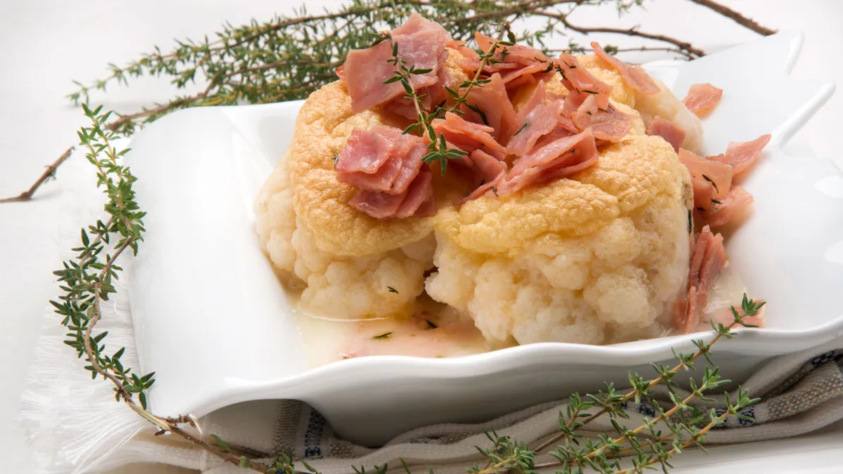 Receta de Karlos Arguiñano de coliflor cocida al vapor en salsa cubierta con yemas de huevo gratinadas y jamón salteado.