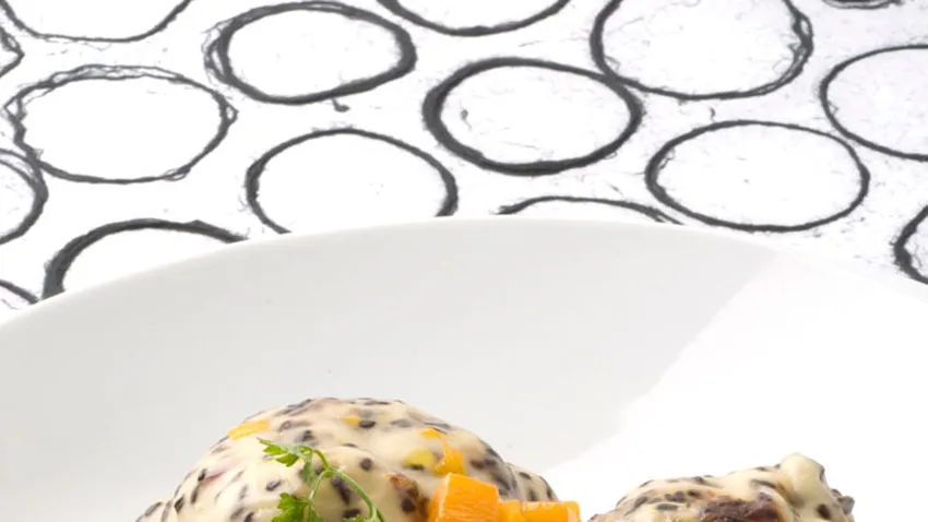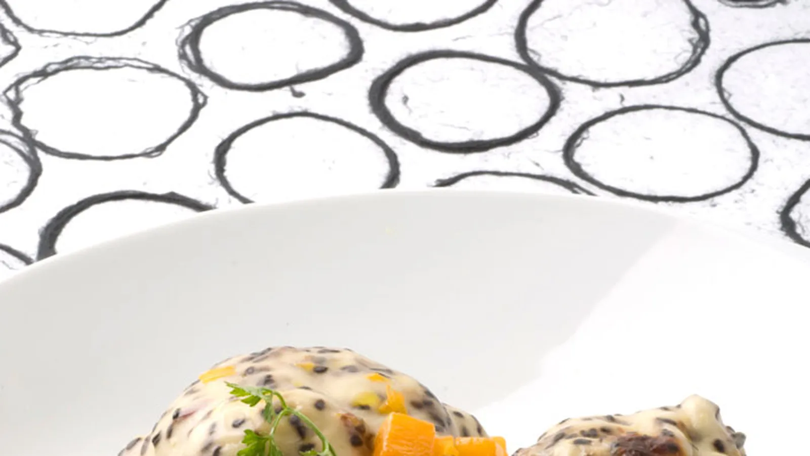 Para la bechamel, pica las lonchas de panceta y ponlas a dorar en una cazuela con un chorrito de aceite. Añade la harina y rehoga. Vierte la leche poco a poco sin parar de remover y cocina a fuego suave durante 10-15 minutos (hasta que quede ni muy ligera ni muy espesa). Espolvorea con el sésamo negro, mezcla y retira del fuego.