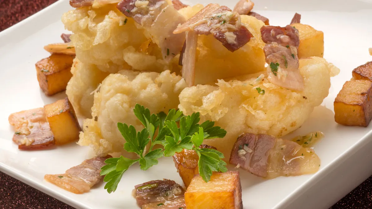 Receta de Karlos Arguiñano de coliflor en tempura acompañada de tocineta salteada y patatas fritas, un plato fácil y rápido de preparar.