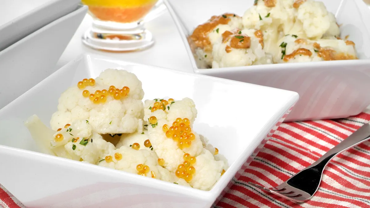 Receta de coliflor al vapor dos salsas, un primer plato otoñal con una deliciosa salsa de tahín y huevas de salmón. Receta de Eva Arguiñano.