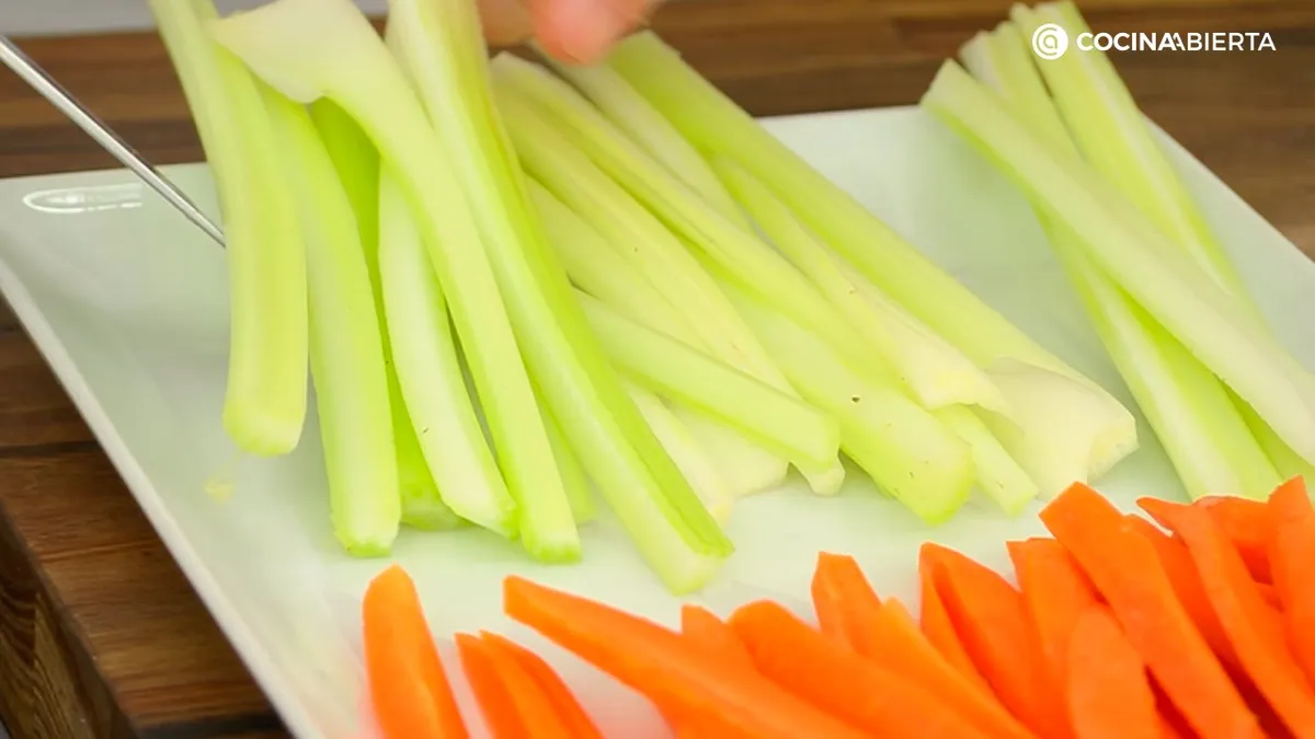 Corta las ramas en tiras más o menos del mismo tamaño que los bastones de zanahoria. Si notas que las ramas tienen hilos o filamentos en el borde, no dudes en retirarlos, ya que pueden resultar algo fibrosos al comer.