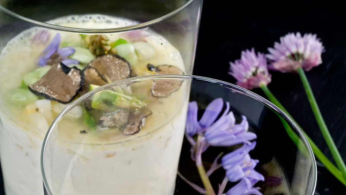 Cuajada de espárragos con habas y trufa