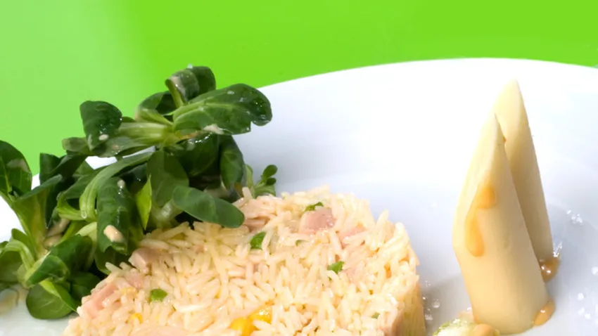Introduce el arroz en un cuenco, incorpora los guisantes, el jamón cocido y el maíz. Vierte la salsa rosa al gusto (el resto ponla en una salsera) y mezcla. Coloca la ensalada de arroz dentro de un molde redondo. Presiona y desmolda. Acompaña con los palmitos, el aguacate y los canónigos. Sazona y sirve.