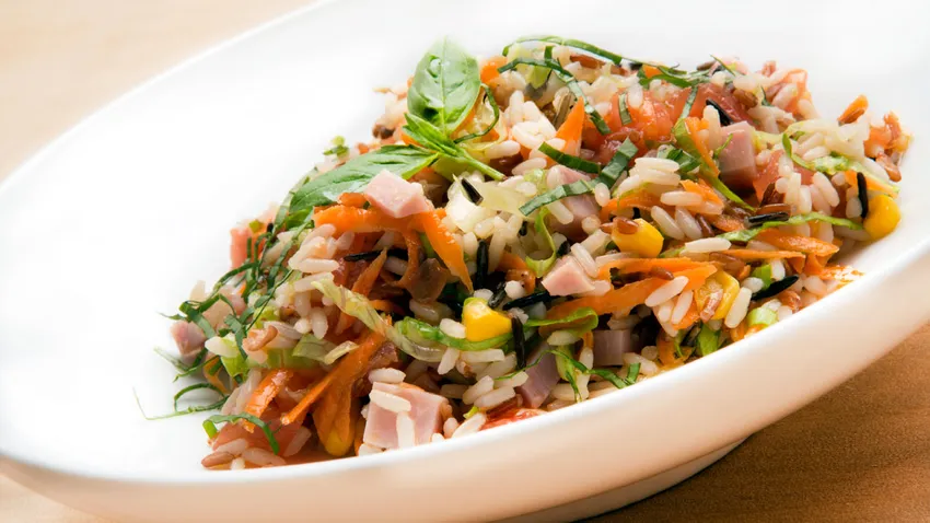 Mezcla todos los ingredientes (arroz, lechuga, tomate, zanahorias, jamón y maíz), aliña con la vinagreta de lima y espolvoréala con las hojas de albahaca cortadas en juliana fina. Sirve la ensalada de arroz.