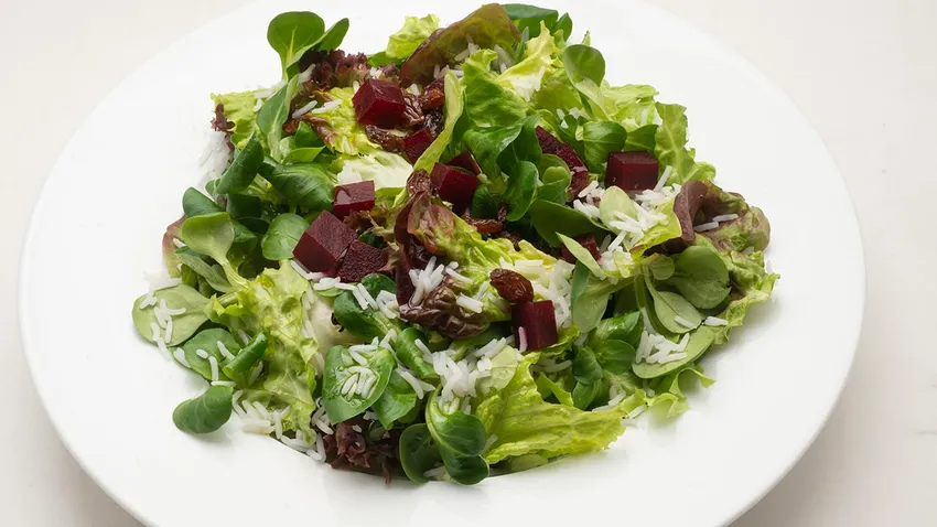 Elaboración de la receta Ensalada de arroz, remolacha y pasas: