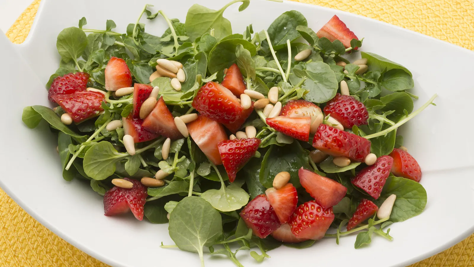 Karlos Arguiñano presenta una ensalada de berros con fresas, piñones tostados y su aliño, un acompañamiento sencillo y de temporada para el plato principal.