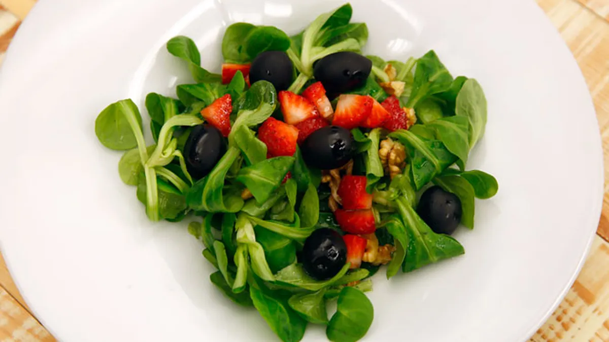 Karlos Arguiñano prepara una ensalada muy primaveral con canónigos, nueces, aceitunas negras y fresas, un plato nutritivo rico en vitaminas.