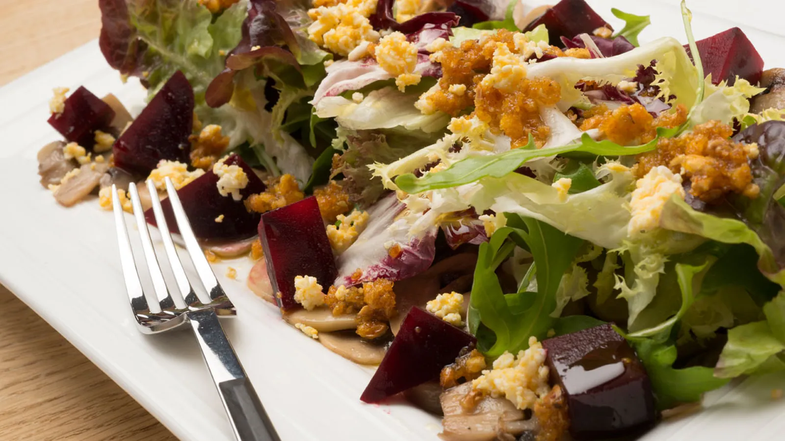 Receta de Karlos Arguiñano de ensalada de champiñones, remolacha cocida, lechuga, maíz y huevo cocido con vinagreta, un plato sencillo y variado.
