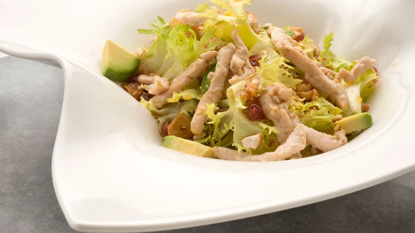 Receta de Karlos Arguiñano de ensalada de cintas de pollo a la mostaza salteadas con escarola, aguacate, granada, maíz y ajos fritos, todo aliñado con vinagreta casera de soja, miel y reducción de vino dulce.