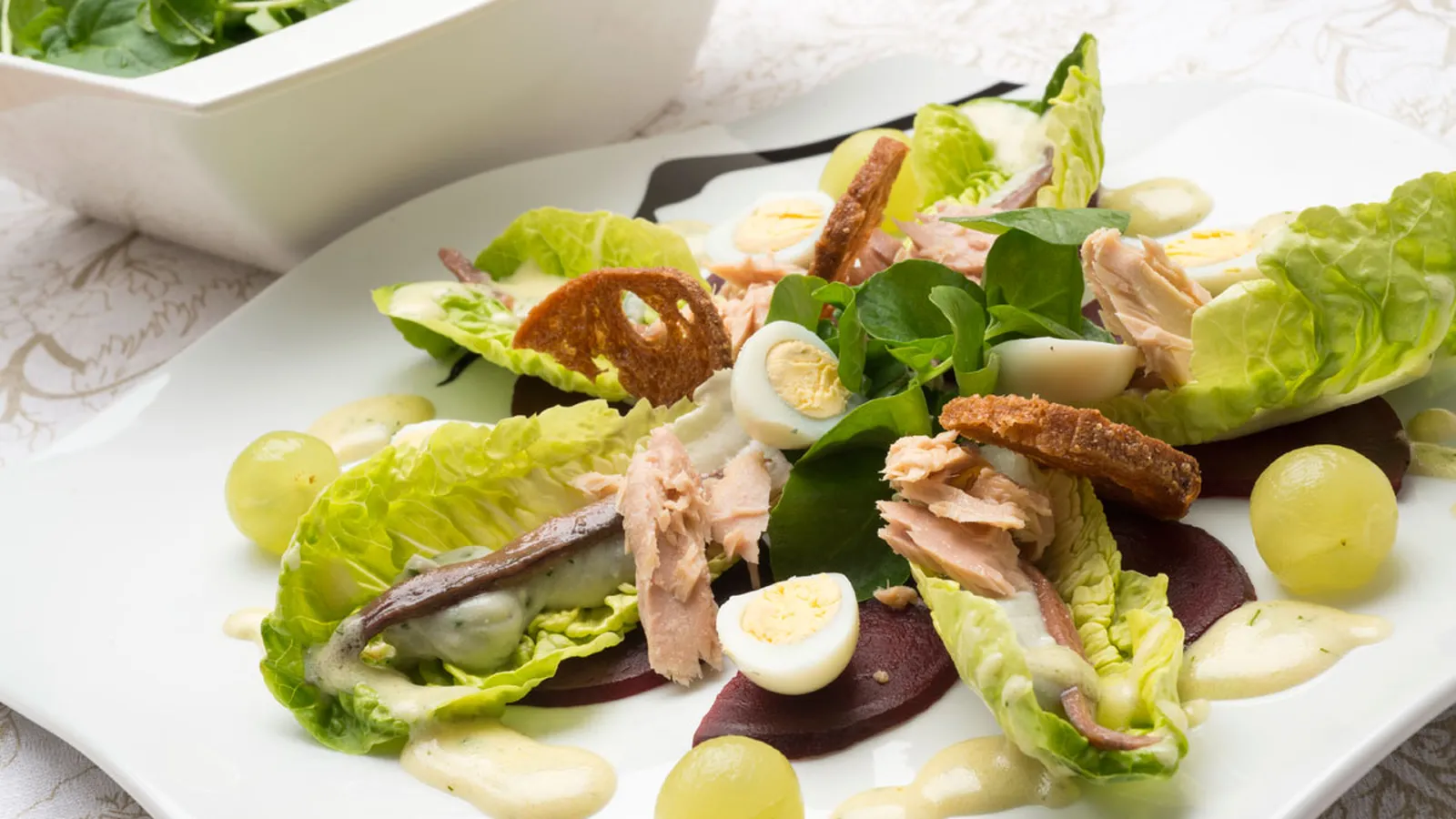 Receta de Karlos Arguiñano de ensalada de cogollos rellenos de queso acompañados de huevos cocidos, berro, pan frito, uvas y bonito, todo ello aliñado con vinagreta de yogur.