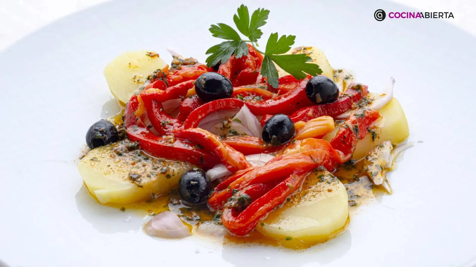 Si te encantan las ensaladas de patata, en lugar de la clásica ensalada campera, te proponemos preparar una ensalada sin lechuga combinando la patata cocida con pimientos rojos asados, acompañada con cebolla morada y aceitunas negras. Y para darle un toque toque especial, ¡una vinagreta picante!