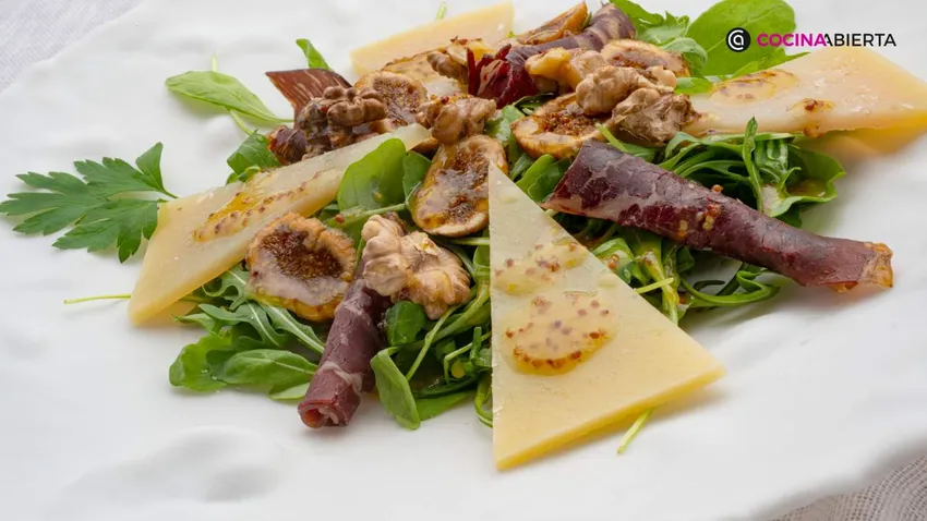 La receta es sencilla, rápida de preparar y muy llamativa. Destaca por el toque crujiente de las nueces tostadas. Para elaborarla, Arguiñano utiliza rúcula, queso en finas cuñas, higos y cecina.