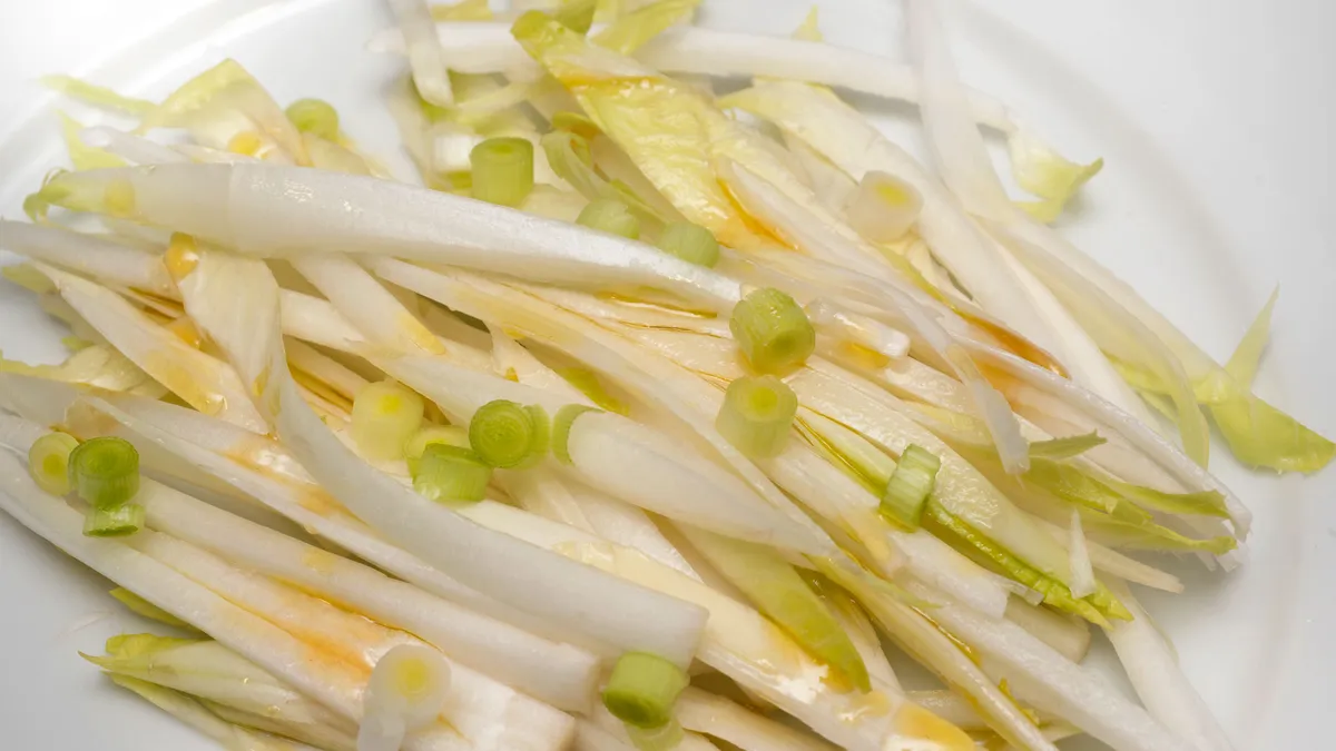 Pica las endibias en juliana fina, colócalos en una fuente. Sazona.