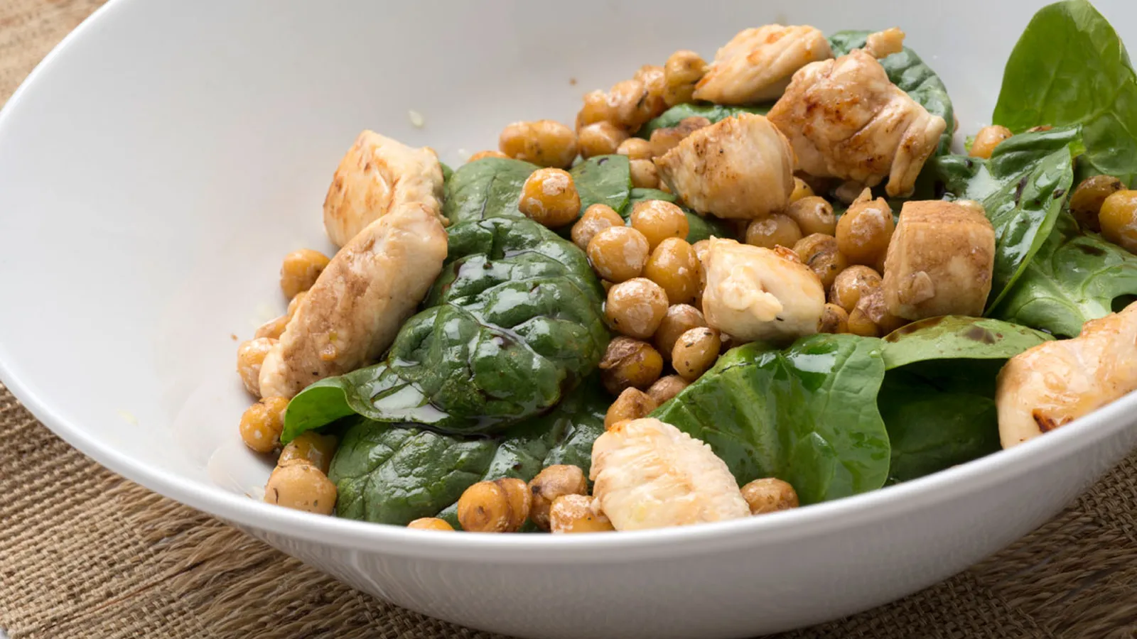 Ensalada de espinacas, pollo y garbanzos tostados