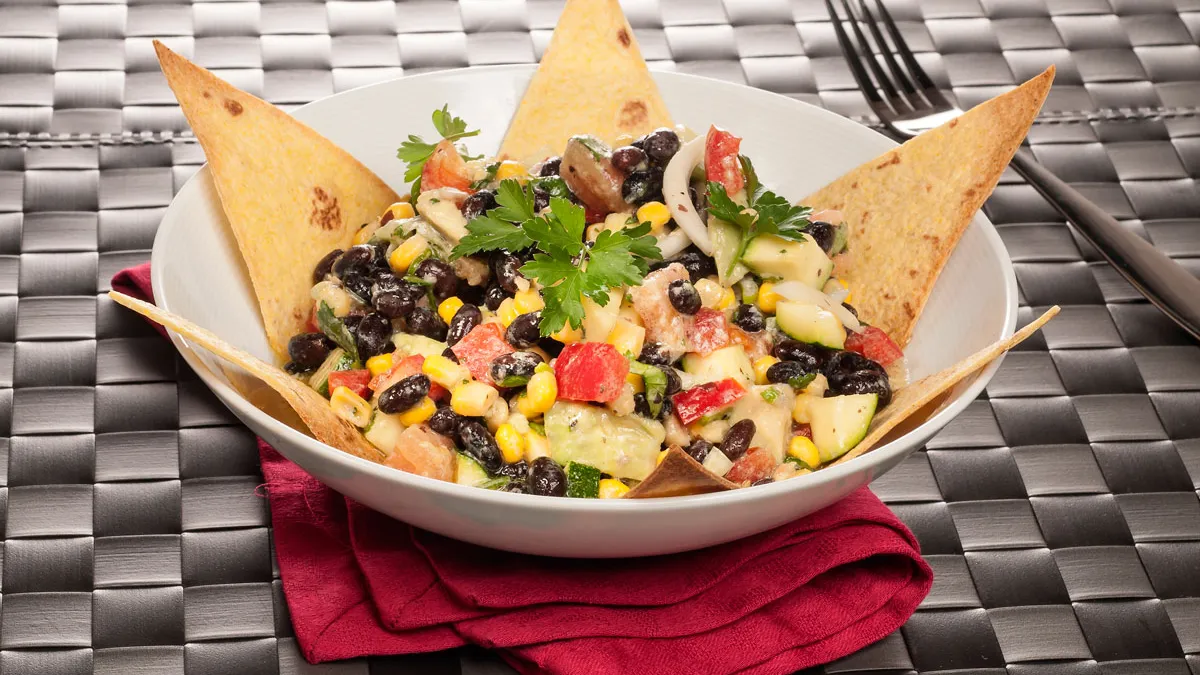 Receta de Bruno Oteiza inspirada en México de ensalada de frijoles con tomate, aguacate, cebolleta, pimiento, calabacín y vinagreta de yogur. Para acompañar, unos totopos, es decir, triángulos de tortilla de maíz horneados.