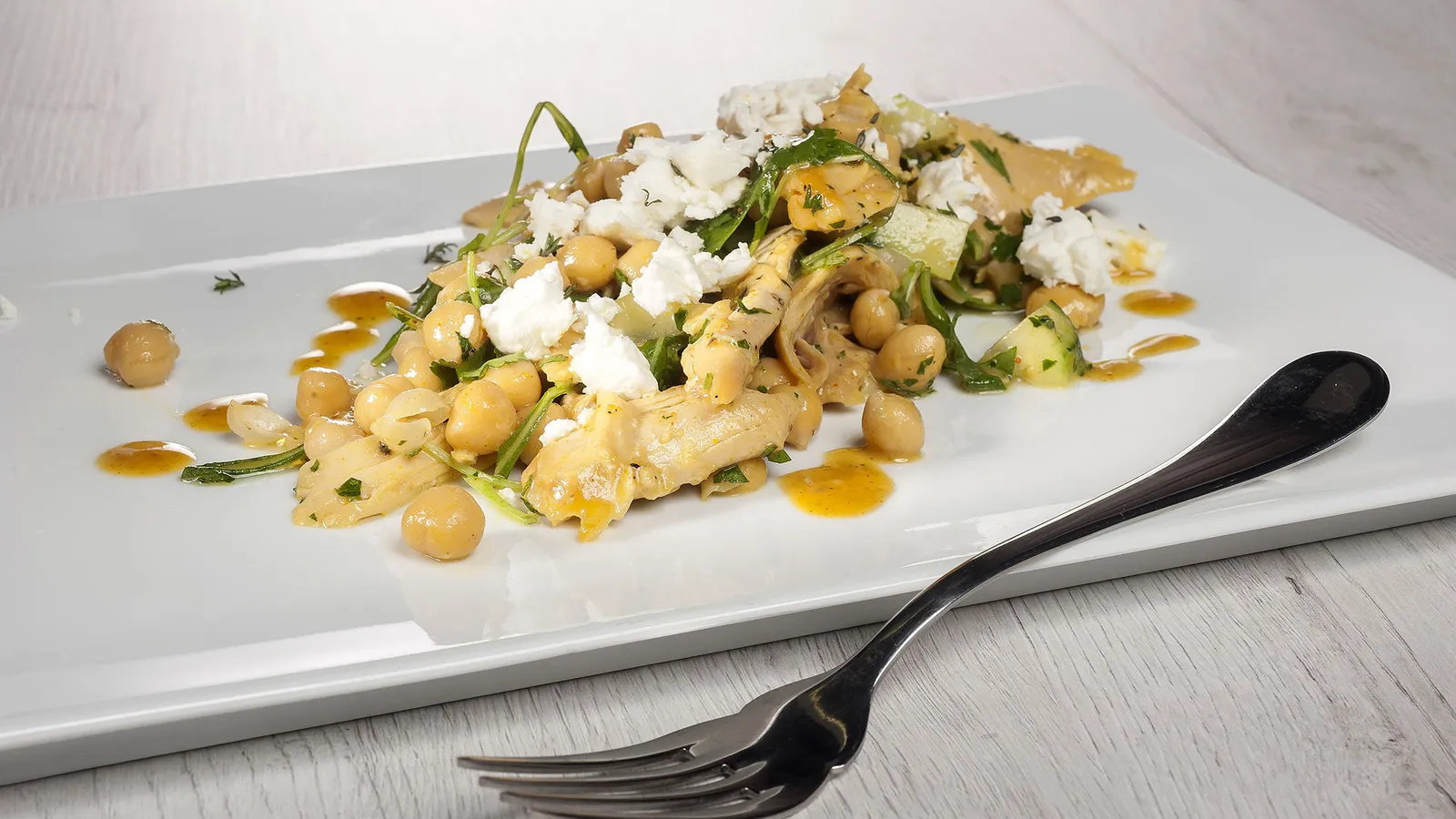 Ensalada de garbanzos con pollo y vinagreta de curry